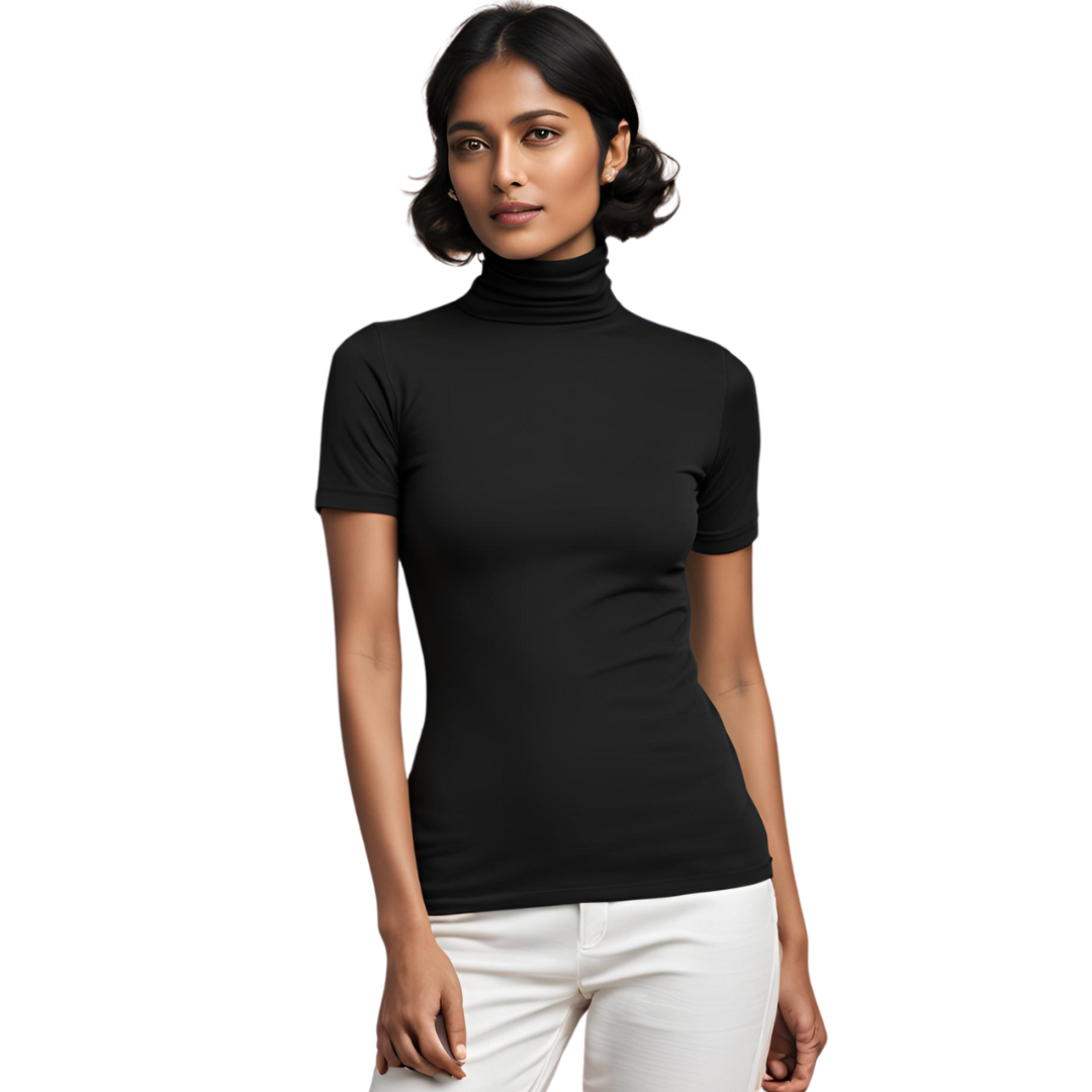 The turtleneck design adds a touch of elegance, making it perfect for dressier occasions as well. The short sleeves are perfect for warmer weather or for layering under a jacket or cardigan on cooler days.